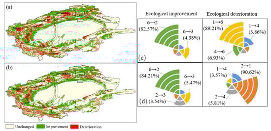 Based on our projections, the basin’s ecological environment is clearly developing in a positive direction. Specifically, the areas of improvement are much larger than the areas of deterioration, probably due to factors, such as slow development and use of cropland and barren land. On the other hand, since the main characteristics of the ecological environmental changes are similar to those of the previous stage, they can also indicate that after 2019, all land types in the basin will develop in a balanced way and the ecological environment will enter a steady improvement stage [].