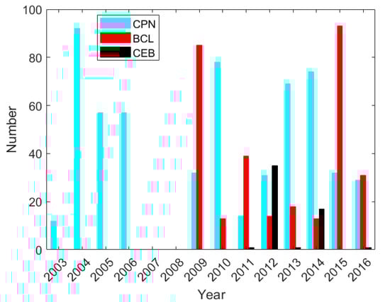 The distribution of the data collected from Chumphon (CPN), Bac Lieu (BCL), and Cebu (CEB) ionosondes stations during equinox seasons from 2003 to 2016.