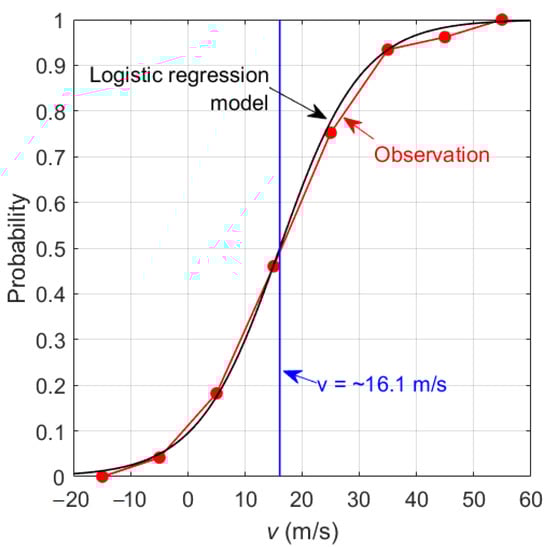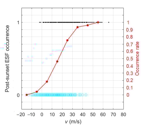 Figure 3 shows the occurrence rate of post-sunset ESF at intervals of −20 ≤ v < −10, −10 ≤ v < 0, 0 ≤ v < 10, …, and 50 ≤ v < 60 m/s. The collected 938 data points of v ranged from approximately −13 m/s to 92 m/s, in which v ≥ 60 m/s values indicate the occurrence of post-sunset ESF. The negative v values show the non-occurrence of post-sunset ESF, except for three data points. As for the v values of 0–40 m/s, the occurrence and non-occurrence of post-sunset ESFs overlap. In general, the red curve shows that the probability of post-sunset ESF occurrence increases when v increases. When v increased from a negative value to 30 m/s, the post-sunset ESF occurrence rate increased from 0 to 0.8. The probability of a post-sunset ESF occurrence higher than 0.5 could occur when the v values are greater than 20 m/s. Furthermore, the post-sunset ESF occurrence rates are higher than 0.8 for v ≥ 30 m/s, and these features are consistent with the findings of a previous study [21]. Figure 3 shows a higher correlation between large v and a higher probability of ESF occurrence, and it is a well-known finding. When v is large enough, the necessary seeding mechanisms for generating strong ESF always appear to be present. Therefore, these two phenomena (v and ESF occurrence) are highly correlated [12,13]. However, the relationship between the probability of ESF occurrence and v cannot be simply approximated by linear regression. This study innovates to implement the logistic regression to model the probability of ESF occurrence. Clearly, the red curve in Figure 3 can be approximated by the logistic regression (Equation (1)) and v can be a good predictor of the z-function (Equation (2)).