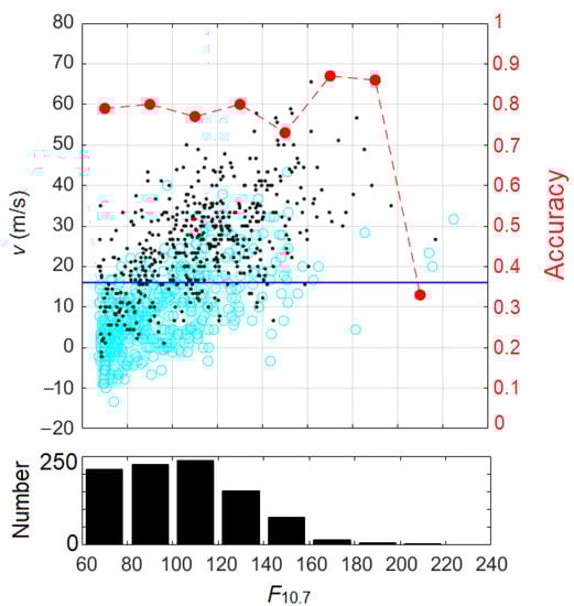 In this study, the threshold of v (~16.1 m/s) for determining the occurrence of post-sunset ESF is a statistical finding. It is well-known that the threshold of v for the occurrence of post-sunset ESF could vary with the level of solar activity [23]. Therefore, we need to check the consistency of the threshold of v (~16.1 m/s) in classifying nights with and without post-sunset ESF occurrences with various solar activity levels. Figure 5 shows the scatter plot of v and F10.7 (upper panel) with the occurrence (black dots) and non-occurrence (cyan circles) of post-sunset ESF. Note that 938 datapoints of v and post-sunset ESF occurrence are plotted in the upper panel. The blue line indicates the v of ~16.1 m/s. The figure intends to check the performance of the threshold of v (16.1 m/s) (blue line) in classifying the occurrence and non-occurrence of post-sunset ESF at intervals of 60 ≤ F10.7 < 80 sfu, 80 ≤ F10.7 < 100 sfu, …, and 200 ≤ F10.7 < 220 sfu. Datapoints above or at the blue line will be classified as the occurrence of post-sunset ESF, whereas data points below the line will be classified as non-occurrence of post-sunset ESF. The number of data points (black dots and cyan circles) at each interval of F10.7 is displayed in the lower panel of Figure 5. At each interval of F10.7, black dots and cyan circles highly overlap. However, by calculating the accuracy of the performance of v (~16.1 m/s) in classifying the occurrence and non-occurrence of post-sunset ESF, the red curve in the upper panel shows the accuracy of ~0.8 in F10.7 values ranging from 60 to 140 sfu. The number of data points is 832 in the F10.7 interval of 60–140 sfu. The number of data points for each F10.7 interval above 140 sfu is significantly decreased (below 80 data points), and the accuracy of the performance may not be reliable. In short, the threshold of v (~16.1 m/s) could be reliable for determining whether post-sunset ESF occurred with the accuracy of ~0.8 in the solar activity F10.7 intervals of 60–140 sfu.