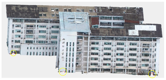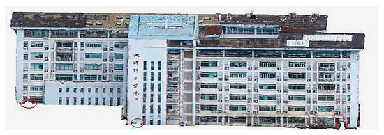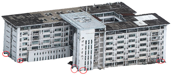 Figure 6 shows an extracted building point cloud, which is a pure point cloud that has filtered out vegetation and obstacles. Some holes that are marked by red circles appear on the facade surface of the building, which are mainly located on the bottom floor of the building near the ground.