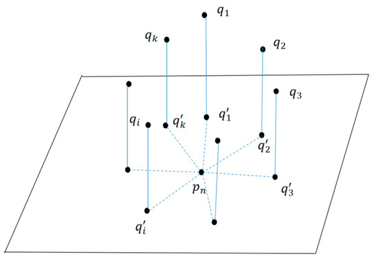 The coordinate of the neighboring point qi is (), and the coordinate of its projection point is . Thus, the projection point can be computed from Equation (8):