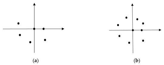 The maximum angle difference is used to judge the uniformity of the distribution of k nearest neighbor points (Q) of point pn [24]. If the neighboring points are not distributed around the point pn, pn is viewed as the border point; otherwise, it is not. For instance, in Figure 4a, the neighboring points of the center point are not distributed around the center point; thus, it is a border point. In Figure 4b, the neighboring points of the center point are uniformly distributed around the center point; thus, it is not a border point.