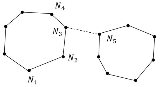 The border points are connected using the vector deflection angle (Equation (10)) and boundary coherence [22,23]. For example, the adjacent points of point are and (Figure 5). If only the distance is considered when the border points are connected, points , , and belong to the same boundary. However, they should belong to different boundaries. Thus, the vector deflection angle is used to sort the border points. The main processes of connecting border points are as follows: First, any border point can be viewed as the starting point, and then the boundary loop can be extracted using the breadth-first search. Next, any unconnected border point can be chosen as the initial point; the above process is performed. Finally, all boundaries can be identified exactly.