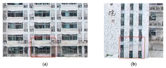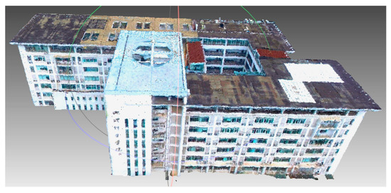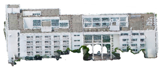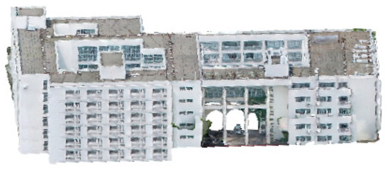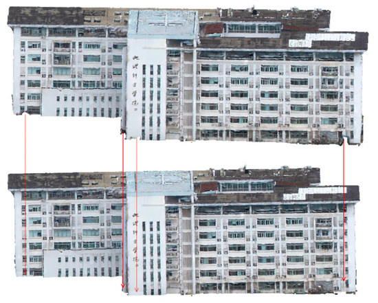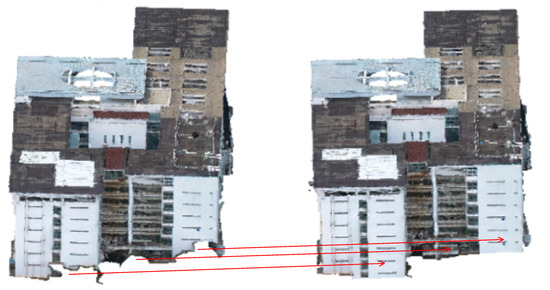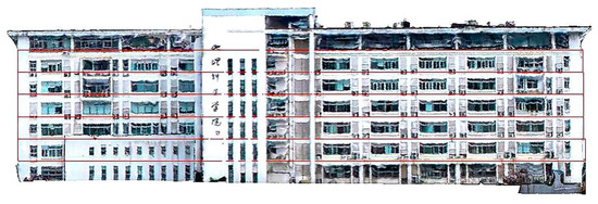 The same area of the building’s adjacent floor is used to repair the holes of the building facade point cloud. According to Equation (12), the bounding box of the hole is shifted units upward, and the new bounding box of the hole can be obtained. If the new bounding box has complete data, the hole can be directly repaired. Otherwise, the bounding box of the hole continues to be shifted units upward. The holes can be wonderfully filled by the above processes; moreover, the filled results can contain the texture information as well as geometry information.
