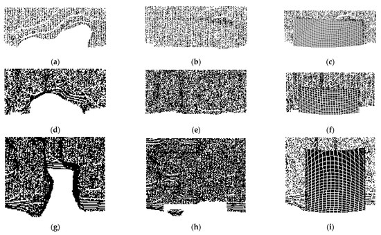 Brunton proposed another method to fill the holes of a point cloud [17]; it projected the hole’s boundary in the 3D models to the two-dimensional (2D) plane, used the improved Delaunay triangulation algorithm to divide the region of the hole on the 2D plane, and then used the minimized energy function to convert the 2D plane to the mesh surface in 3D space. Unfortunately, this method was limited by the size of the hole boundary and caused some damage to the original model to a certain extent. Based on Brunton’s method, Fortes proposed a shape feature determination method [4]. Based on the minimum energy function, it generated hole patches for the original holes. However, this method requires good quality data around the holes. Wang proposed a method based on feature line extraction to fill the holes [18]. Using this method, feature lines were first extracted to obtain the sequence of control points of each hole, and Non-Uniform Rational B-Splines (NURBS) was used to fit and fill the holes. Frias proposed a method of filling the holes based on the superposition and comparison of the two cutwaters [19]. First, two cutwaters are segmented, then the translation-fitting of the whole cutwater over the damaged one is performed. Second, the damaged cutwater can be reconstructed when two cutwaters of the bridge point cloud are correctly aligned. The method can obtain better results, but it requires much manual intervention in the processing; therefore, the method is difficult to apply to buildings in the city.