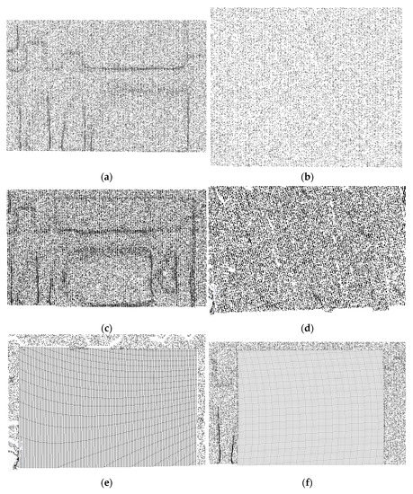 The filled results of artificial holes using different approaches are presented in Figure 13. Figure 13a,b shows the original point cloud of artificial holes 1 and 2, respectively; Figure 13c,d shows the corresponding repaired results using the proposed method; Figure 13e,f shows the corresponding filled results using the MLS. Overall, Figure 13 shows that the filled results using the proposed method are similar to the original building point cloud. Compared with Figure 13a,c, it is shown that the filled result can preserve the original building features and objects’ structural information, such as windows, quite well. Compared with Figure 13a,e, it is shown that the filled results using the MLS fit the smooth surface without preserving the details. Thus, the filled results cannot be smoothly connected with the original point cloud. Furthermore, although the artificial holes span two floors, the filled results using the proposed method are ideal.