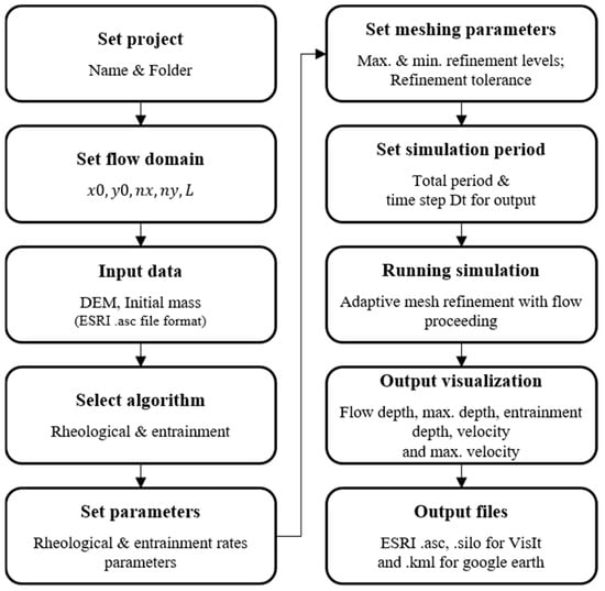 Numerical models based on shallow-water-type governing equations frequently suffer from the imbalance that occurs between the slope of the water depth and the slope on irregular terrain. This imbalance may cause unphysical perturbations and fluctuations in the simulation near shocks or wet–dry transitions. Deb2D implements the hydrostatic reconstruction technique proposed by Audusse et al. [37], which has successfully been applied to the quadtree adaptive grid-based shallow-water equation. For a detailed numerical discretization and scheme, refer to An et al. [25,38]. In addition, Figure 1 depicts a flowchart of the Deb2D model.