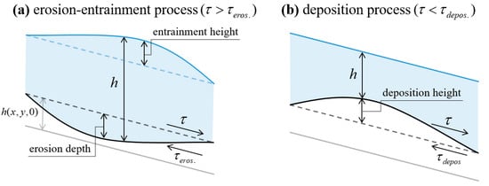 where dz/dteros. is a constant erosion–entrainment rate; dz/dtdepos. is a constant deposition rate; τ is the basal shear stress; τeros. and τdepos. are the critical shear stress of erosion and deposition, respectively; hmax(x, y, 0) is the initial height of the erosion–entrainment layer at position (x, y). dz/dτ is the average potential erosion depth; ρ is the mass density; and s is the channel slope. Figure 2 briefly illustrates this algorithm. In addition, this algorithm’s performance, which well simulated the erosion–entrainment–deposition process, has been verified based on laboratory experiments conducted by Lim et al. [41].