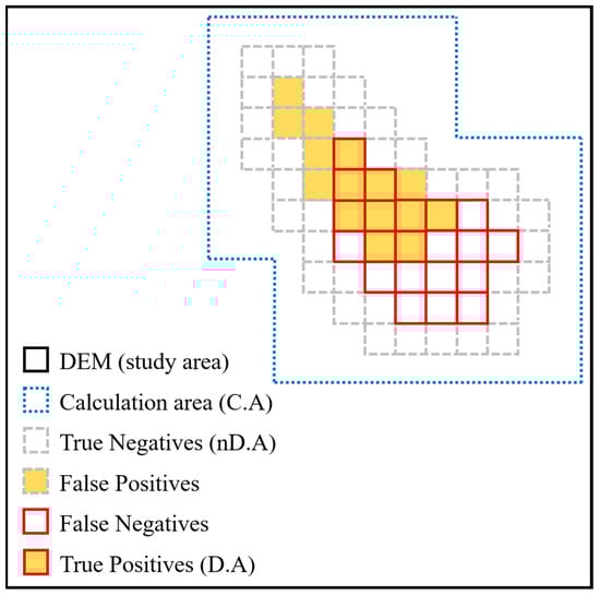 where Acc., which is the accuracy, is a value in the range 0–1 and 1 denotes 100% accuracy and 0 denotes 0% accuracy. D.A is the area that successfully implemented the actual damaged area; nD.A denotes the area that was not damaged and also indicates that the simulation results showed that there was no damage; and C.A is the calculation area (Figure 3). For details regarding the ROC method, please refer to Godt et al. [42] and Cepeda et al. [43].