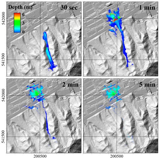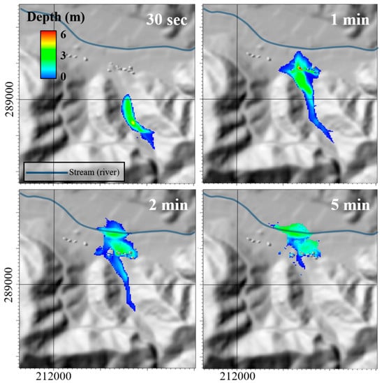 To precisely analyze this phenomenon, Figure 6 and Figure 7 show the height of the debris flow over time in the Raemian apartment basin. Figure 6 shows the results when the deposition was considered; when the flow time reached 2 min, most of the debris flow had stopped and was deposited. The damage range did not spread any farther. However, according to the simulation results in Figure 7, which did not consider the deposition process, the flow of sediment did not stop over time and the impact area was unphysically expanded. In addition, we attempted to determine the effect of the parameter change in the deposition algorithm on the estimation of the damaged area (Figure 8). A larger dz/dtdepos. meant that the deposition process was larger and the simulated impact area was very small. Conversely, when the parameter was closer to 0, the impact area was wider.