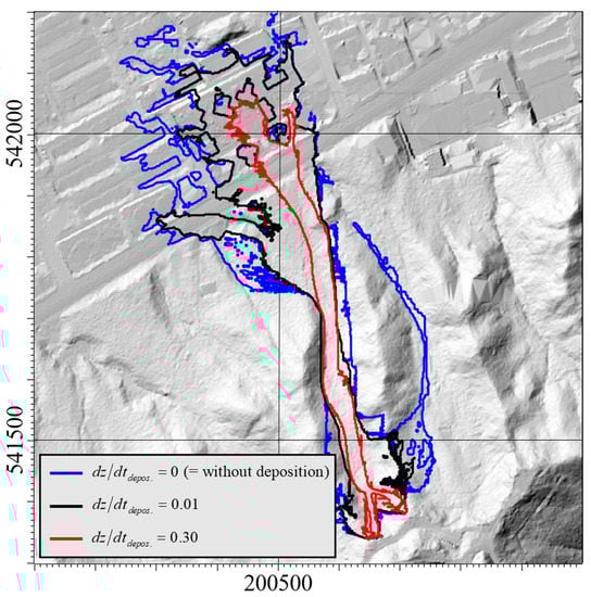 In particular, deposition played a significant role in estimating the range of the damaged area caused by debris flows. In addition, the debris flows over time revealed that the deposition process helped assess the flow time. Debris flow analyses that consider erosion, entrainment, and deposition should help analyze the topography change more precisely. The overall analysis results demonstrated an approximately 0.13–0.17 (13–17%) higher accuracy when considering deposition. According to this result, analyses of debris flow events that account for the erosion–entrainment–deposition process could calculate the impact area, flow time, and topography changes. In other words, the deposition process helps simulate the debris flow so that the results are closer to the natural phenomenon along with the erosion–entrainment process.