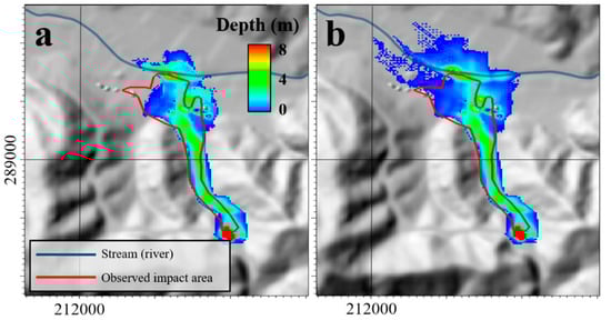 Maximum depth of the debris flow at Seongdeok basin after 5 min (a) with deposition and (b) without deposition.