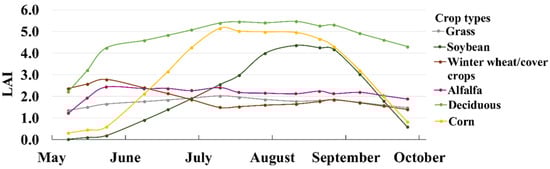 | Winter wheat/cover crops/Alfalfa | LAI = 3.618 × EVI − 0.118 | [57] | May–September |