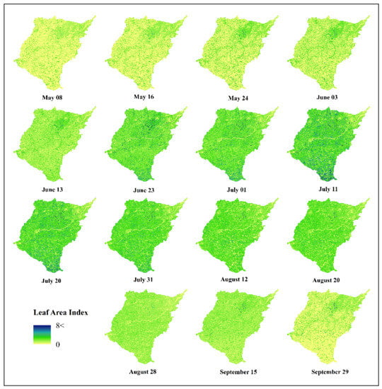 | LAI = (a × EVI + b)2; a = 2.42, b = 0.34 | [56] | June/July/August | |