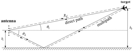 where is the working wavelength, is the multipath coefficient, is the surface reflection coefficient, which is the product of the smooth surface reflection coefficient, the divergence factor, and the surface roughness factor [], and is the phase of . is the Gaussian white noise vector with a zero mean, which is independent of the target signals. The noise power of a single element is . Additionally, given the geometric relationship illustrated in Figure 1, can be simply determined by
