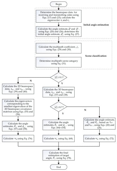 The proposed method introduces novelties in five distinct ways. First, using 3D beamspace data to solve the multipath coefficient for MIMO radar; second, effectively constructing beamspace data for transmitting and receiving sides; third, developing a scene-classification strategy based on the multipath coefficient, which takes into account the case of flat terrain and undulating terrain; fourth, using 3D beamspace data to solve the closed-form solution of the target angle based on a refined signal model for MIMO radar; and fifth, using 2D beamspace data to solve the closed-form solution of the target angle with no multipath signal for MIMO radar.