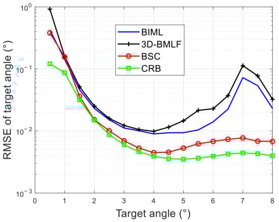 Firstly, the RMSEs of the target angle for each of the three algorithms are shown against the target angle in a flat reflector scene. For and , the RMSE of the target angle corresponding to the three algorithms is plotted against the angle and the CRB in Figure 3. The BSC algorithm outperforms the BIML and 3D-BMLF algorithms, especially in high-angle areas, and the BSC algorithm is closer to the CRB than others. When the angle is small, the RMSE of the three algorithms is greater. In addition, the RMSE fluctuates more significantly for BIML and 3D-BMLF.