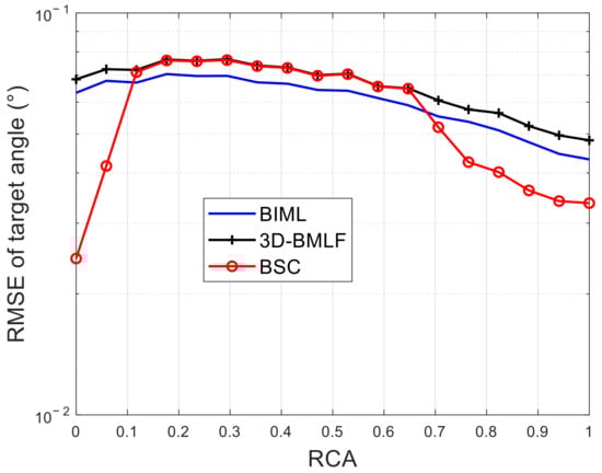 Secondly, the influence of the RCA on the estimation accuracy is investigated. Assuming , , and , the RMSEs of the target angle for the three algorithms are plotted against the RCA in Figure 4, where the RCA=0 indicates that no multipath signal exists in the target echo. The estimation error of the BIML and 3D-BMLF algorithms diminishes as the RCA grows. The BSC algorithm achieves the lowest estimation error when the RCA is large than 0.7 or less than 0.1. When the RCA is small but greater than 0.1, the BSC algorithm performs identically to the 3D-BMLF algorithms in terms of estimation accuracy.
