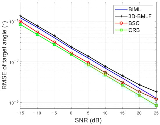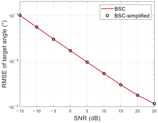 Thirdly, the RMSE of the target angle for the three algorithms is shown against SNR. Assuming and , the RMSEs of the target angle for the three algorithms are shown against SNR in Figure 5. As the SNR increases, the estimation error of the three algorithms reduces. The RMSE of the BSC algorithm is closer to the CRB and is lower than that of the other algorithms. The RMSE of the target angle for the BSC algorithm and the simplified BSC algorithm are plotted against SNR in Figure 6. As observed, the BSC algorithm performs identically to the simplified BSC algorithm in cases where .