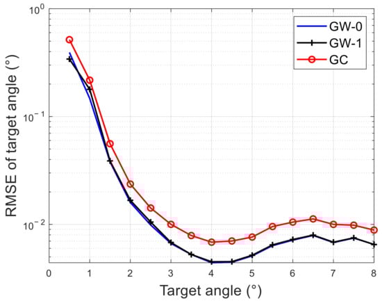 Fourthly, the RMSE of the target angle for the BSC algorithm under different noise types is shown against the angle. For and , Figure 7 shows the RMSE of the target angle for the BSC algorithm against the angle, where the three noise types are Gaussian white noise with a mean value of zero, Gaussian white noise with a mean value of 0.1, and Gaussian colored noise with a mean value of zero, denoted by GW-0, GW-1, and GC, respectively. As can be observed, the BSC algorithm performs differently under various noise types. The estimation accuracy under colored noise is inferior to the estimation accuracy under white noise.