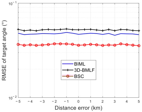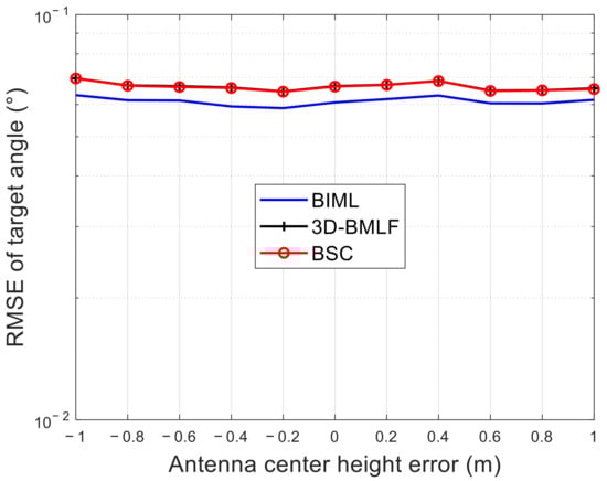 Fifthly, the influence of the target distance error and the antenna center height error on the accuracy is investigated for the BIML, 3D-BMLF, and BSC algorithms. It is assumed that and . For , the RMSEs of the target angle for the three algorithms are plotted against the target distance error in Figure 8. For , the RMSEs of the target angle for the three algorithms are illustrated against antenna center height error in Figure 9. As can be observed, the influence of target distance and antenna center height errors on the accuracy of these three algorithms is negligible.