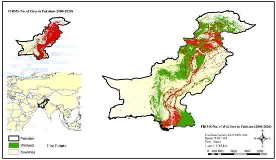 Climate warming has increased the danger of wildfire disasters around the world. One of the most serious dangers to wildland ecosystems is fire. Fire is regarded as a key factor in both the growth and the degradation of wildland ecosystems globally [,]. Despite the fact that fire has always been a force in landscape modification and renewal, fire occurrences can have severe human, environmental, and economic repercussions, particularly when they become huge wildfires []. They can have a deleterious impact on the composition and structure of fauna and flora, as well as the quality of air, soil, and water [,]. They also result in financial losses and endanger human health and life [,,,]. Increased fire frequency and intensity have been observed in Asian countries, albeit at varied rates. According to several studies, global climate change will likely increase the frequency and intensity of wildfires in most parts of the world in the future [,,,,]. Pakistan has one of the world’s lowest forest covers, with only 4.5% of its land covered in forest, and it is experiencing significant forest depletion []. During the second half of the 20th century, there was evidence of higher fire incidence than prior years in Pakistan, as well as in other regions, a constant increase in the frequency of big wildfires, and an increase in the length of burned territory [,].