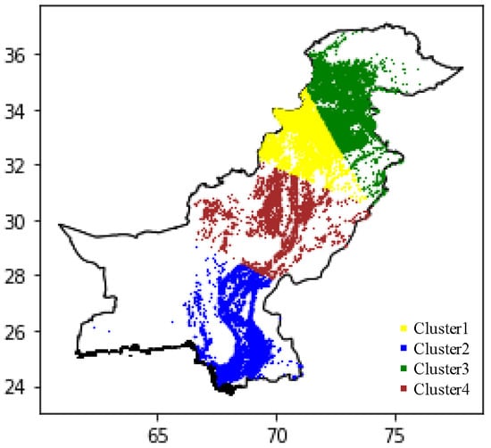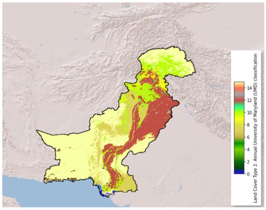 The total number of fires was calculated using data from the Fire Information for Resource Management System. FIRMS provides satellite-derived near-real-time data within 3 h of satellite observation. FIRMS is a component of NASA’s Land, Atmosphere Near Real-Time Capability (LANCE) for Earth Observatory System (EOS), and it transmits data from both the Moderate Resolution Imaging Spectroradiometer (MODIS) and the Visible Infrared Imaging Radiometer Suite (VIIRS) to Terra and Aqua EOS []. On the ground, the active flames displayed in Figure 1 and Figure 2 are represented by pixels covering 1 km2. As a result, this pixel may include one or more fire spots within a 500 m radius. Furthermore, a variety of parameters, such as scan angle, land surface temperature, and smoke volume, impact the smallest detectable fire size. Above 1000 m2, MODIS can identify both burning and smoldering flames; however, smaller blazing fires can be detected under extremely clear observing circumstances (50 m2). Active flames, such as those caused by human activity, industries, and volcanoes, can also be spotted as thermal anomalies. The FIRMS dataset includes active fire sites using the pixel value, which determines the temperature of the surface in Kelvin. At annual intervals, the MCD12Q1-V6 package gives worldwide land-cover categories (2001–2016) in Aqua and Terra. The MODIS Land Cover Type 2 Classification designed by the University of Maryland was used in this study (MODIS land cover). Figure 2 presents the land-cover classification map for Pakistan using projection WGS84, with a global spatial coverage of 500 m. Fires that occurred in a University of Maryland Dataset (UMD)-designated region were filtered and labeled as wildfires. UMD’s landcover classification was employed as a guide, with classifications indicating shrublands, savannas, and wildlands (classes: 1–10) [].