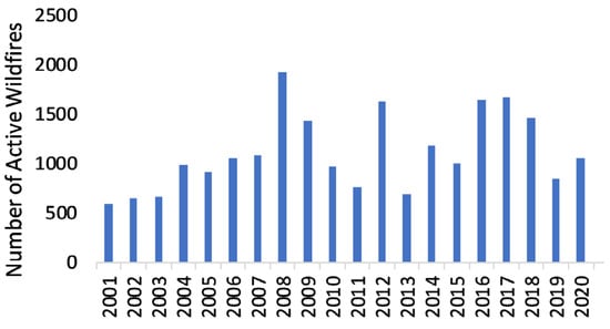Total number of pixels presenting active wildfire on an annual basis (2001 to 2020).