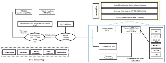 The approach utilized to achieve the study’s two primary objectives is described in this section. The first step was to establish the best fit model for fire susceptibility, and the second was to identify the driving elements that influence fire susceptibility under various situations. The methodology is broken down into three sections: (a) data preparation and preprocessing, (b) classification, and (c) validation and evaluation matrix. This structure is presented in the flowchart in Figure 5, summarizing the essential processes employed in this study. The entire procedure was applied to the dataset in four dimensions: (1) total dataset, (2) data divided by seasons, (3) geographical data clustered on the basis of density, and (4) data divided into 5 year gaps.