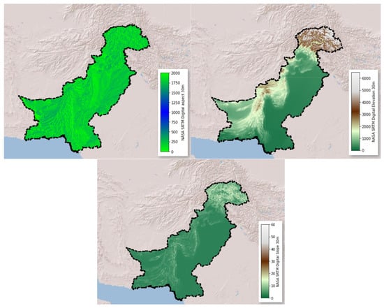 In our research, we employed a variety of derived and main climatic variables. FWI has never being used in Pakistan, and the parameters utilized in global FWI are limited. For FWI’s proposed datasets, GLDAS and Terra Climate data were picked due to their higher spatial resolution. Temperature was chosen because it has an impact on soil moisture and is linked to vegetation combustion. Elevation, slope, and aspect in Figure 6 constituted the topographic category. The elevation was calculated using a digital elevation model (DEM) with a spatial resolution of 30 m. The model was created using a dataset obtained from NASA’s Shuttle Radar Topography Mission (SRTM) []. DEM was used to calculate the slope or gradient of the terrain represented as an angle and aspect, commonly known as the direction in which the slope faces. Land cover, fraction of photosynthetically active radiation (FPAR), leaf area index (LAI), normalized difference vegetation index (NDVI), and tree cover were all included in the vegetation category of fuel, as shown in Figure 7. The vegetation layer (NDVI) is directly provided by the MOD13Q1 raster product with a 250 m spatial resolution. The combined FPAR absorbed by plant canopy green components and LAI are offered by MCD15A3H-V6 level 4. The Copernicus Global Land Service (CGLS) is a multipurpose service component of the land service that delivers a number of bio-geophysical products describing the state and evolution of land surface at a global scale []. The product contains continuous field layers for all basic land-cover classes, which provide proportionate estimates of vegetation/ground cover for the various land-cover categories. The tree cover fraction was calculated as a percentage of vegetation cover for the wildland from the land-cover class.