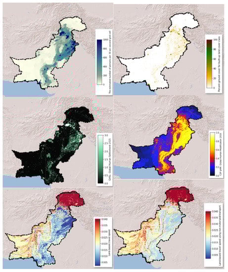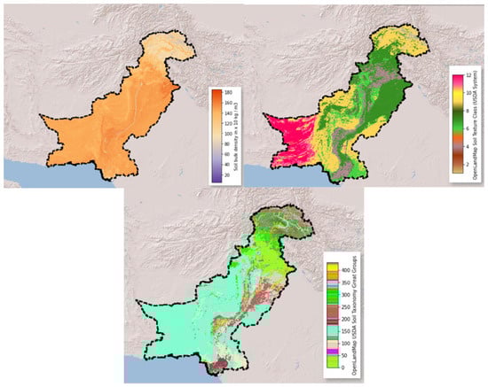 According to national censuses and population records, these population count grids included estimates of the number of people every 30 arc-second grid cell. Each 5 year gap was represented by a single picture. Percentage ground cover for the built-up land-cover class was chosen as the urban cover fraction from the CGLS. There was a continuous growth in per pixel population of Pakistan by year; hence, the built-up area increased. Figure 9 gives a picture of growing population per pixel from year 2001 to 2019, as well as the annual change of built up area from 2015–2019. Soil data included soil texture classes (USDA system), soil great group, and soil bulk density (fine earth) 10 × kg/m3 at 0 cm depth with 250 resolution, as presented in Figure 10 [,,].