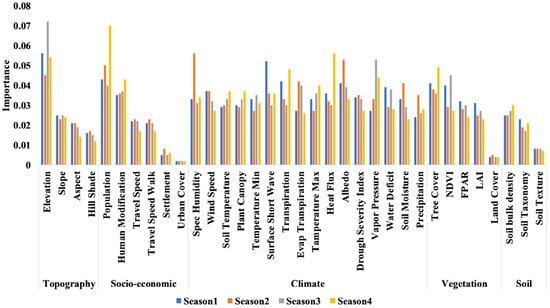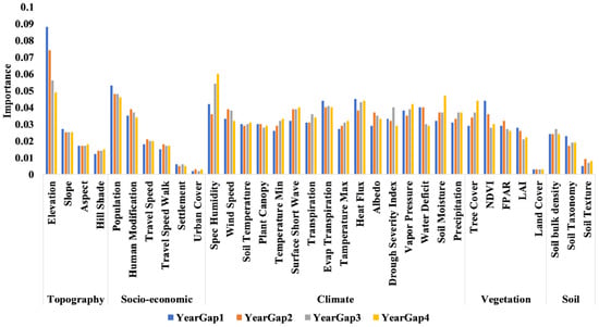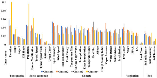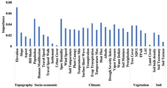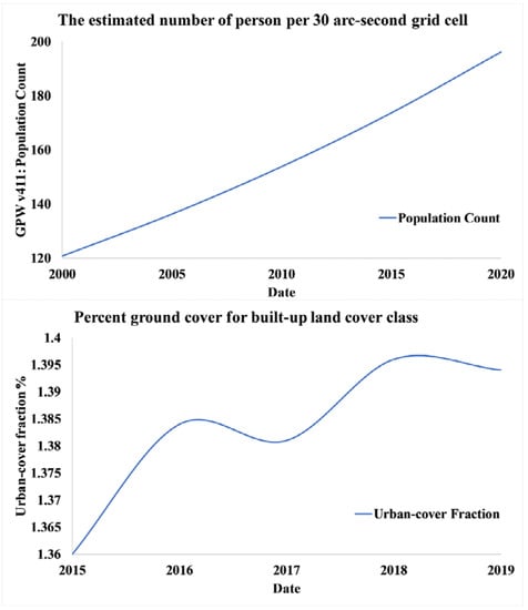 Global Human Modification (GHM) [], population, global human settlements, and global friction statistics were all included in the socioeconomic category, as presented in Figure 8. The GHM dataset provides a global assessment of human alteration of terrestrial areas with a spatial resolution of 1 km. The GHM values range from 0 to 1 and are linked to a certain type of human alteration, sometimes referred to as a stressor. Human habitation, transportation, mining, and energy generation are examples of important anthropogenic stresses. The World Pop dataset estimates the number of people living in 85 million grid cells (population count). The degree of urbanization for 2015 was provided by the Global Human Settlement Layer. The degree of urbanization divides a country’s total area into urban and rural zones for the year 2019. The global friction surface enumerates land-based travel speed for all land pixels between 85° north and 60° south. It also includes “walking only” travel speeds, which are achieved by relying solely on nonmotorized modes of transportation []. A proportionate distribution of population from census and administrative units was used to disperse people to cells.