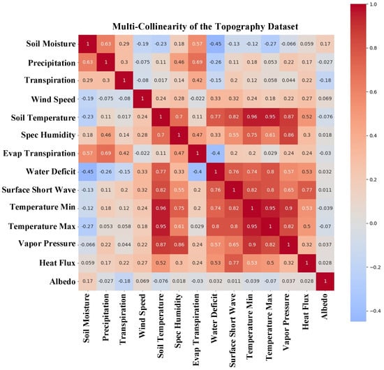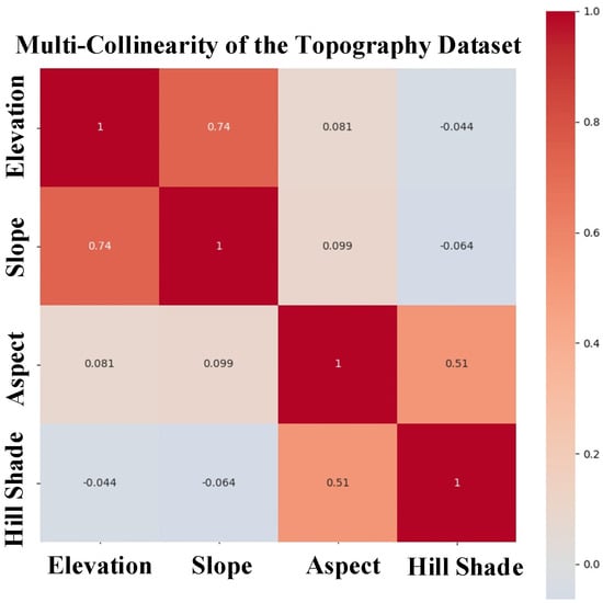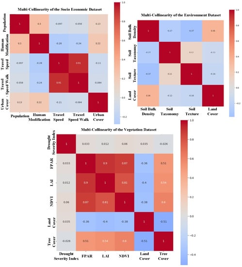 The Spearman rank correlation test is a nonparametric test used to determine the degree and direction of the connection between wildfire explanatory variables (positive or negative). The entire negative and positive linear correlation is represented by Spearman’s rank correlation coefficient, which ranges from −1 to 1. Spearman’s correlation coefficients for the three categories of wildfire explanatory variables were computed individually. Figure 11, Figure 12 and Figure 13 show the correlation among all groups of data. Each cell in the correlation matrix indicates a “correlation coefficient” between the two variables corresponding to the row and column of the cell. In the correlation matrix of the topography dataset, a large positive correlation (0.74) was indicated between elevation and slope, i.e., if the value of one of the variables increased, the value of the other variable increased as well. In the correlation matrix of socioeconomic data, a large positive correlation (0.81) was indicated between travel speed and travel speed by walking. In the correlation matrix of vegetation data, a large positive correlation was indicated between NDVI and FPAR (0.87), between NDVI and LAI (0.81), and between FPAR and LAI (0.9). In the climatic dataset, the temperature minimum and temperature maximum showed a correlation of (0.91) with soil temperature. Furthermore, the temperature minimum and temperature maximum were also correlated (0.95). Most values were near to 0 (both positive and negative), indicating the absence of any correlation between those variables and, hence, their independence.