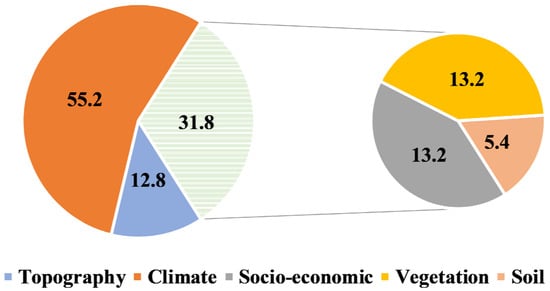 Driving factors: In predictive modeling, selecting independent variables, also known as predictors or conditioning factors, is a crucial step. A total of 34 driving factors were chosen for this investigation on the basis of field observations from several studies [,,] and public and worldwide satellite data. Although there are no strict guidelines on which variables should be included in a model, most studies considered geomorphological, climatic, and human-related variables to be conditional factors [].