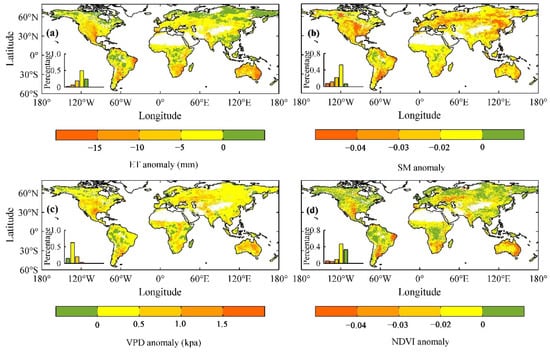 Changes in ecohydrological variables during the drought period based on SPI-12. (a–d) show the anomalies in ET, SM, VPD and NDVI, respectively, in the drought period compared to those in the non-drought period. Water, barren land and regions without any relevant drought events were masked.