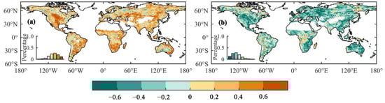 To evaluate the effect of drought on ecohydrological variables, we computed the anomalies in the ecohydrological variables in the drought period relative to the non-drought period between 1982 and 2015. The results show that, in the high latitudes of the Northern Hemisphere, eastern Asia, the Amazon Basin and central Africa, ET and NDVI increased under drought conditions (the areas with increased ET and NDVI accounted for 24.03% and 32.98% of the total global terrestrial vegetation land, respectively), while, in the other regions of the world, the occurrence of drought caused decreases in ET and NDVI (the area percentage were 75.97% and 67.02%, respectively) (Figure 2a,d). SM decreased in most regions of the global terrestrial vegetation land (93.47%) during the drought period, while VPD increased in 85.41% of the globe (Figure 2b,c). We further calculated the Spearman correlation coefficient of NDVI and ET, SM and VPD during the drought period based on SPI-12 between 1982 and 2015. The results show that NDVI was positively correlated with ET in 80.47% of the total global vegetation land (Figure 3a), and 85.23% of the regional SM was negatively correlated with VPD (Figure 3b). Consequently, it is apparent that a decrease in surface SM caused by drought is often accompanied by an increase in VPD in most parts of the world; a decrease (or increase) in NDVI in more than 80% of the total global vegetation land is often accompanied by a decrease (or increase) in ET during a drought period. The variation in ecohydrological variables during the drought period based on the SPEI-12 and scPDSI is consistent with that of the SPI-12 (Figures S4 and S5), indicating that the impact of drought on ecohydrological variables does not vary depending on the selected drought indicators.