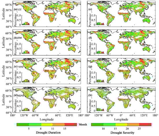 Spatial patterns of drought thresholds (characterized by drought duration and drought severity) when the drought caused the ecohydrological variables change (SPI-12). The left and right columns show the results for the drought duration (a–d) and drought severity (e–h), respectively. The rows from top to bottom represent ET, SM, VPD and NDVI, respectively. Water, barren land and regions without any relevant drought events were masked.