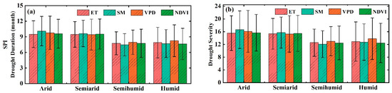 Comparing the differences in the disturbance of ecohydrological variables caused by drought in various climatic regions, we found that different drought indicators showed that drought processes with longer duration and greater severity (the average drought duration and drought severity were 9.63 ± 2.78 months, 15.73 ± 5.60) could cause changes in ET, SM, VPD and NDVI in arid and semiarid regions compared to those in humid and semihumid regions (the average drought duration and drought severity were 7.80 ± 2.63 months, 12.77 ± 5.34). This significant discrepancy (p < 0.05) suggested that ecohydrological variables in humid and semihumid regions are more sensitive to drought (Figure 6 and Figure S9). To eliminate the impacts of high-intensity human activities on ecohydrological variables, we removed areas with high population densities (>10 persons/km2) based on the obtained population density data. The results consistently showed that humid and semihumid regions were more sensitive to drought (shorter duration and lower severity of drought event in semihumid and humid regions; the average drought duration and drought severity were 7.37± 2.62 months, 12.11 ± 5.39) than arid and semiarid regions (the average drought duration and drought severity were 9.20 ± 2.55 months, 14.89 ± 5.09) (Figure 7a,b, Figures S10a,b and S11a,b). At the same time, the durations and severities of drought events that caused disturbances to ecohydrological variables in areas with high population densities under the same climatic conditions were larger than those in areas with fewer human disturbances (Figure 7c,d, Figures S9c,d and S11c,d). We further assessed whether these differences were significant based on the Mann–Whitney–Wilcoxon test, and the results indicate that there were significant discrepancies in the response thresholds to drought for the same ecohydrological variable in the same condition under the influence of human activities (p < 0.05, Table S4), which means that high-intensity human activities in different climatic conditions increased the severity of drought processes. We further compared the differences in the response thresholds of ecohydrological variables to drought in rained croplands and irrigated croplands. The results show that the durations and severities of drought events that caused disturbances to ecohydrological variables in irrigated croplands regions (the average drought duration and drought severity were 11.08 ± 3.12 months, 18.10 ± 6.33) were larger than those in rained croplands regions (the average drought duration and drought severity were 10.84 ± 2.50 months, 17.38 ± 4.92) (as shown in Figure S12). We also assessed whether these differences were significant based on the Mann–Whitney–Wilcoxon test, and the results illustrated that there were significant discrepancies in the response thresholds to drought for the same ecohydrological variable between rained croplands and irrigated croplands (p < 0.05). Compared with rained croplands, irrigated croplands are more strongly affected by human activities, so the above results also indicated that high-intensity human activities can increase the severity of regional drought processes.