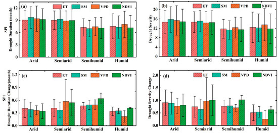 Drought thresholds (characterized by drought duration and drought severity) in various climate regions (excluding regions with high population densities (population density > 10/km2, (a,b)). (c,d) represent the relative changes in drought thresholds in various climate regions (thresholds in whole study area minus thresholds in areas with low population densities)). The error bars indicate ±1 standard error.