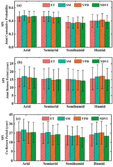 The joint cumulative probabilities (a) and return periods (b,c) of drought characteristics when the ecohydrological variables changes were caused by drought in various climate regions (SPI-12). The error bars indicate ±1 standard error.