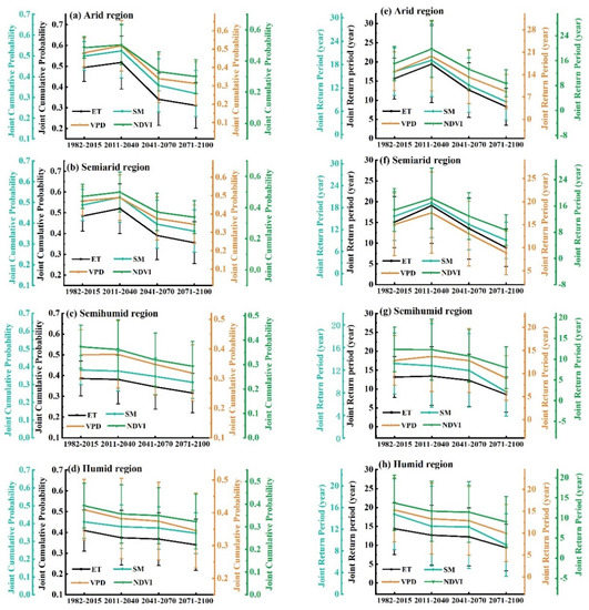 Changes in the joint cumulative probabilities (a–d) and joint return periods (e–h) of corresponding drought characteristics when the ecohydrological variables change in various climate regions. Each climate zone represents the joint cumulative probability and joint return period values of ET, SM, VPD and NDVI in the four time periods of 1982–2015, 2011–2040, 2041–2070 and 2071–2100. The error bars indicate ±1 standard error.