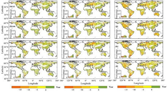 We further analyzed the relative changes in the joint return period at different stages in the future (2011–2040, 2041–2071 and 2071–2100) relative to the historical period (1982–2015). We found that, compared with the period from 1982 to 2015, the proportion of areas with shortened drought return periods in 2011–2040, 2041–2071 and 2071–2100 will gradually increase (Figure 10). Between 2071 and 2100, more than half of the world’s ecohydrological variables will be more susceptible to drought disturbances. The regions with shortened return periods of drought events that cause significant changes in ET, SM, VPD and NDVI account for 60.1%, 64.4%, 59.6% and 54.5% of the global land area, respectively, as shown in Figure 10i–l. Especially at the junction of Europe and Russia and in the central United States, the Amazon River Basin, southern Argentina, South Africa, southeastern China, Southeast Asia and most parts of Australia, higher frequencies of drought events that cause changes in ecohydrological variables under the background of global warming are expected. Ecosystem managers should conduct comprehensive management practices in response to global climate change based on the thresholds associated with significant changes in different ecohydrological variables caused by drought disturbances.