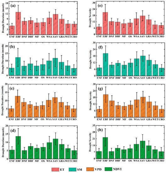 Drought thresholds (characterized by drought duration (a–d) and drought severity (e–h)) of ecohydrological variables in different biome types. The error bars indicate ±1 standard error.