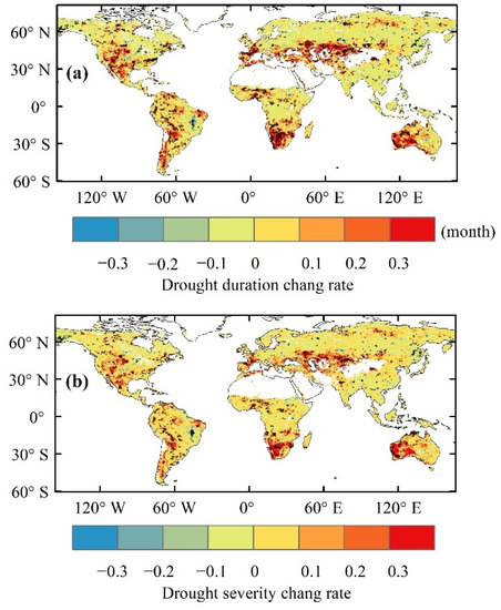 Spatial distribution of trends in drought duration (a) and drought severity (b) over the period 1982–2100 (black “+” indicates the trend is statistically significant at the 5% level).