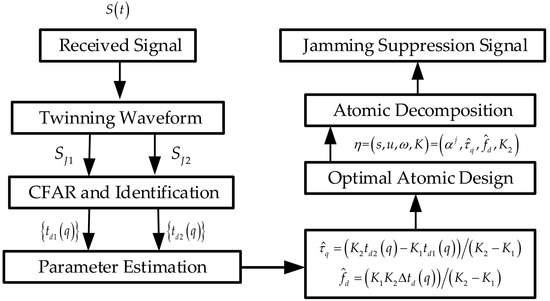 Therefore, in combination with the twinning waveform design [24], this paper proposes an optimal atomic decomposition suppression method based on jamming characteristic parameters. The parameters set by the atomic dictionary are optimized by the estimated jamming characteristic parameters, the target echo and smart noise signals are projected onto different atomic bases, and the jamming signals are separated and eliminated effectively.