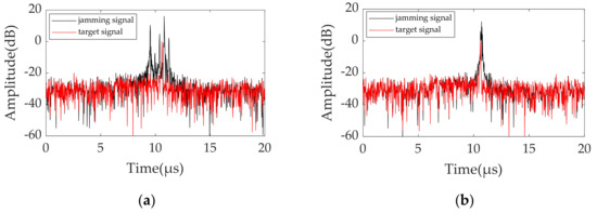 The number of the jamming delay sequence and jamming frequency sequency introduced by the jammer are five, which is same with Section 5.1. Next, the jamming decomposition performance is analyzed when the jamming delay sequence is and the jamming frequency sequence is , where SNR is 20 dB, and JSR is 14 dB to ensure that the energy of each jamming component is consistent with the target signal.