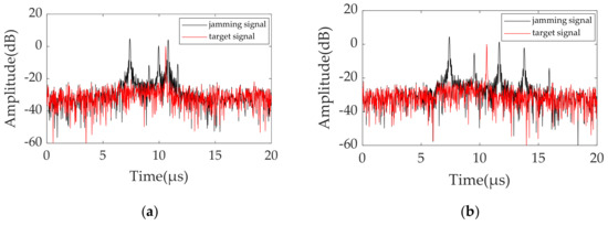 It can be seen from Figure 4 that the jamming signal presents a distribution similar to a Gaussian white noise sequence in the time domain, while in the frequency domain, it is modulated with Gaussian white noise within the effective frequency band. Compared with the traditional noise jamming, the energy of the forwarded target signal is effectively utilized and the energy power of the jammer is improved.