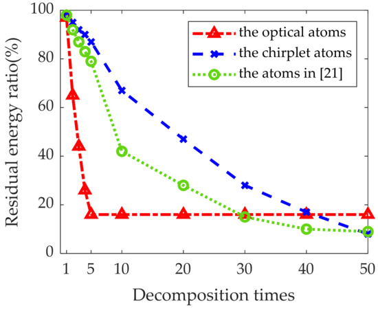 In order to measure the performance of the atomic decomposition algorithm, it is necessary to analyze the change of the residual signal energy ratio with different atomic dictionaries with decomposition times. After the k-th decomposition, the residual signal energy ratio is .