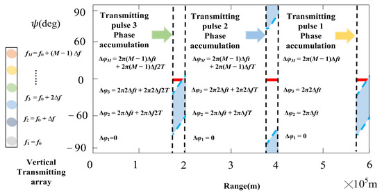 where represents time delay. . The conventional pulse system FDA radar pattern is characterized by S-shaped moving within the pulse width. When the pulse width is not large enough, the high gain irradiated zone of its main lobe is limited and the full angle coverage of [−90, 90] cannot be realized. Due to the frequency increment between array elements, the initial phases accumulated by each array element are also different after a pulse period, T. As a result, because each pulse has different initial phases, the high gain irradiated angular region of the main lobe within the pulse width is also different, i.e., the main lobe moving problem of FDA radar. Therefore, it is impossible to irradiate the target at the same angle with high gain within the coherent processing interval, let alone carry out signal processing such as coherent accumulation or clutter cancellation for the same target. The radar cannot complete its normal operation. Figure 2 is the schematic diagram of FDA radar range (time domain)-angle two-dimensional transmitting pattern. The red 0 degree is the desired target position. In the figure, three pulses transmitted by the radar are drawn. The gray box represents the pulse width, the main lobe distribution of FDA radar pattern in the box is represented by a blue dotted line, and the initial phase of the array element of the three pulses is also marked. In the figure, ∆f = 1/(2T). We note that the range of the main lobe irradiation angle of the first pulse pattern is [−30, 0], while each array element of the second pulse accumulates the initial phase of 2π∆fT(m−1), compared with the first pulse. M represents the array element serial number. The zone of the main lobe irradiation angle of the second pulse becomes [−60, −90] and [70, 90]. The accumulated phase of the third pulse accumulation is 2π∆f2T(m−1). As a result of ∆f = 1/(2T) in the figure, the initial phase of the third pulse accumulation is an integral multiple of 2π. Therefore, the third pulse and the first pulse have the same main lobe irradiation zone.